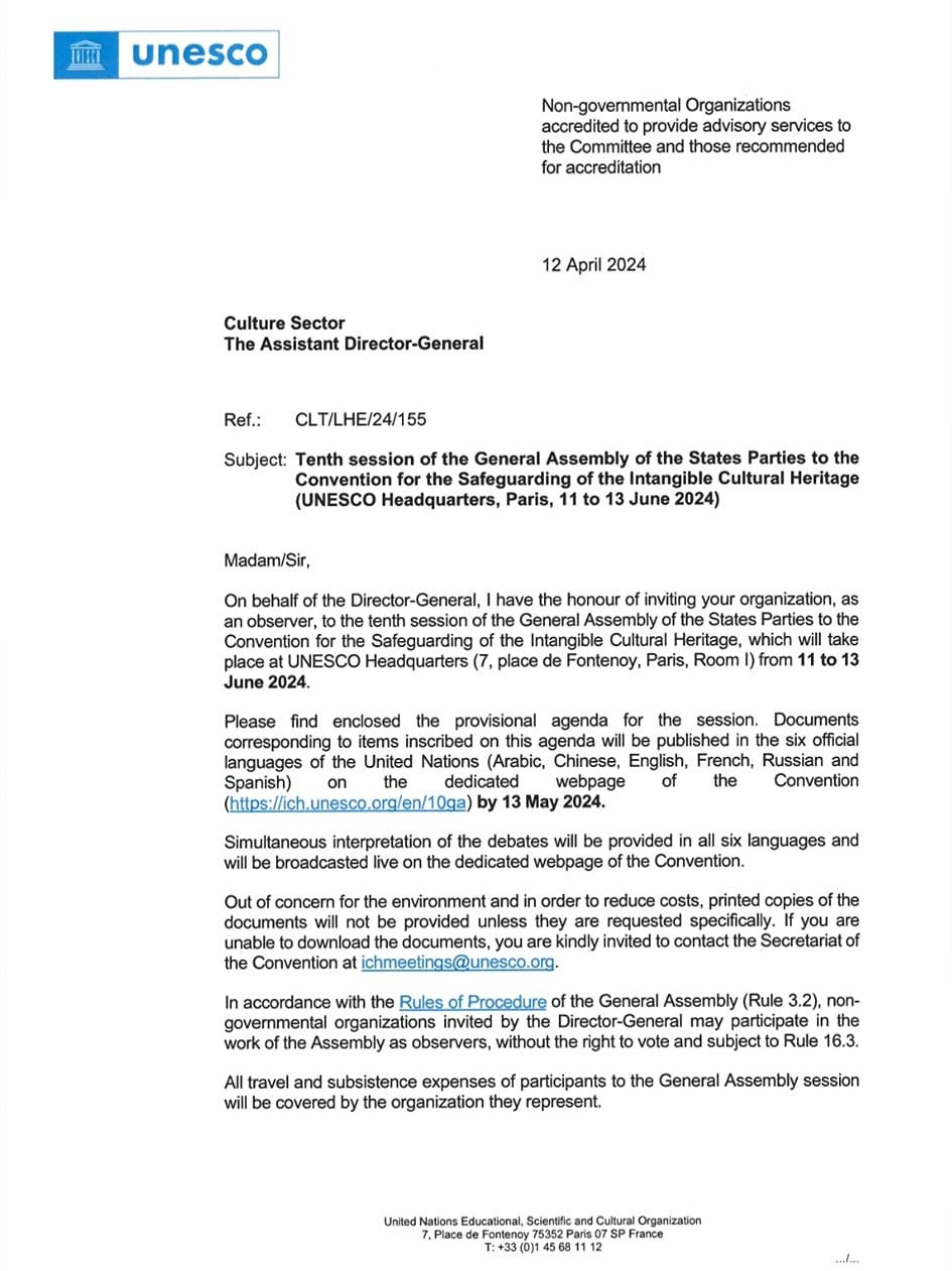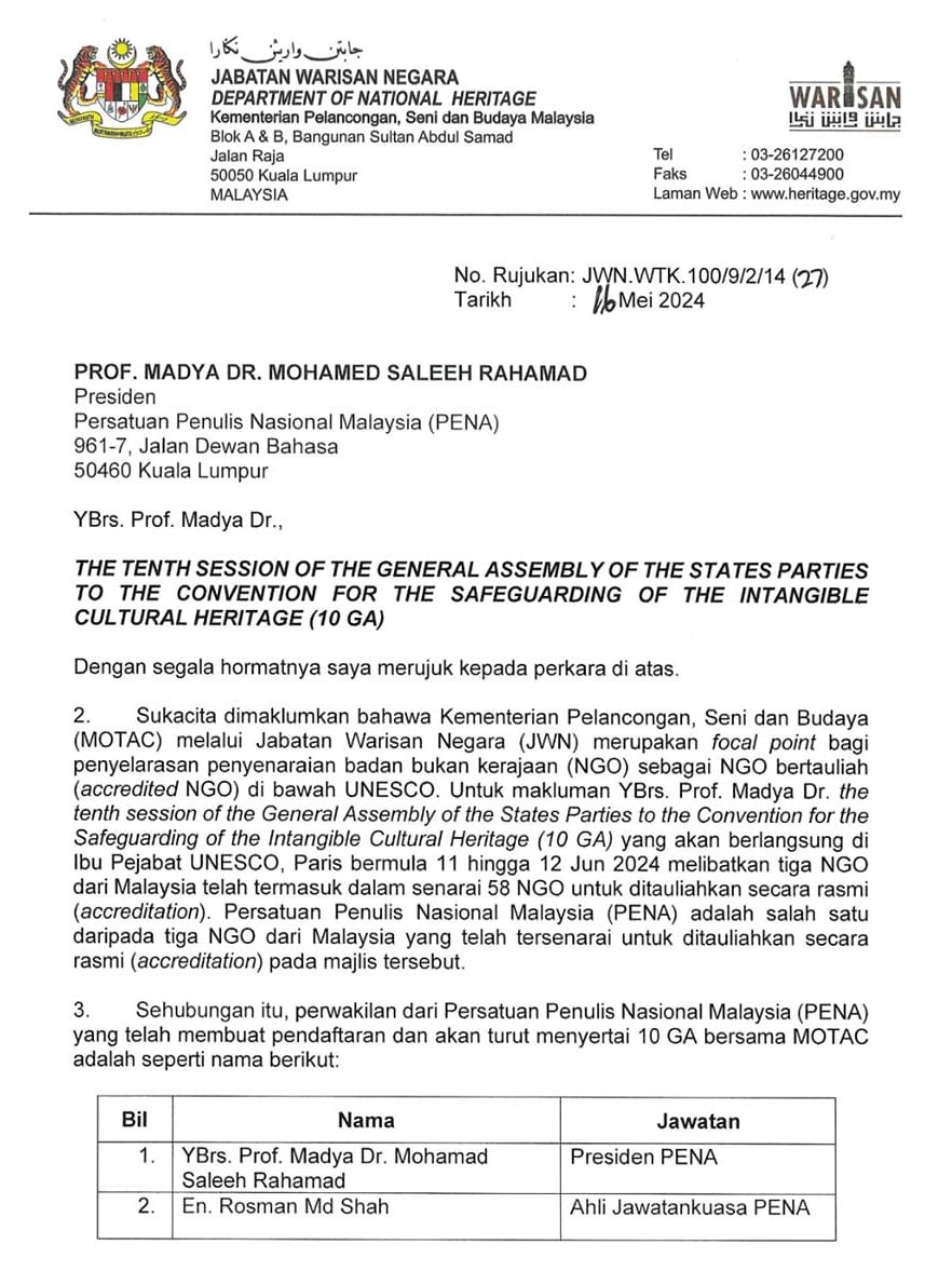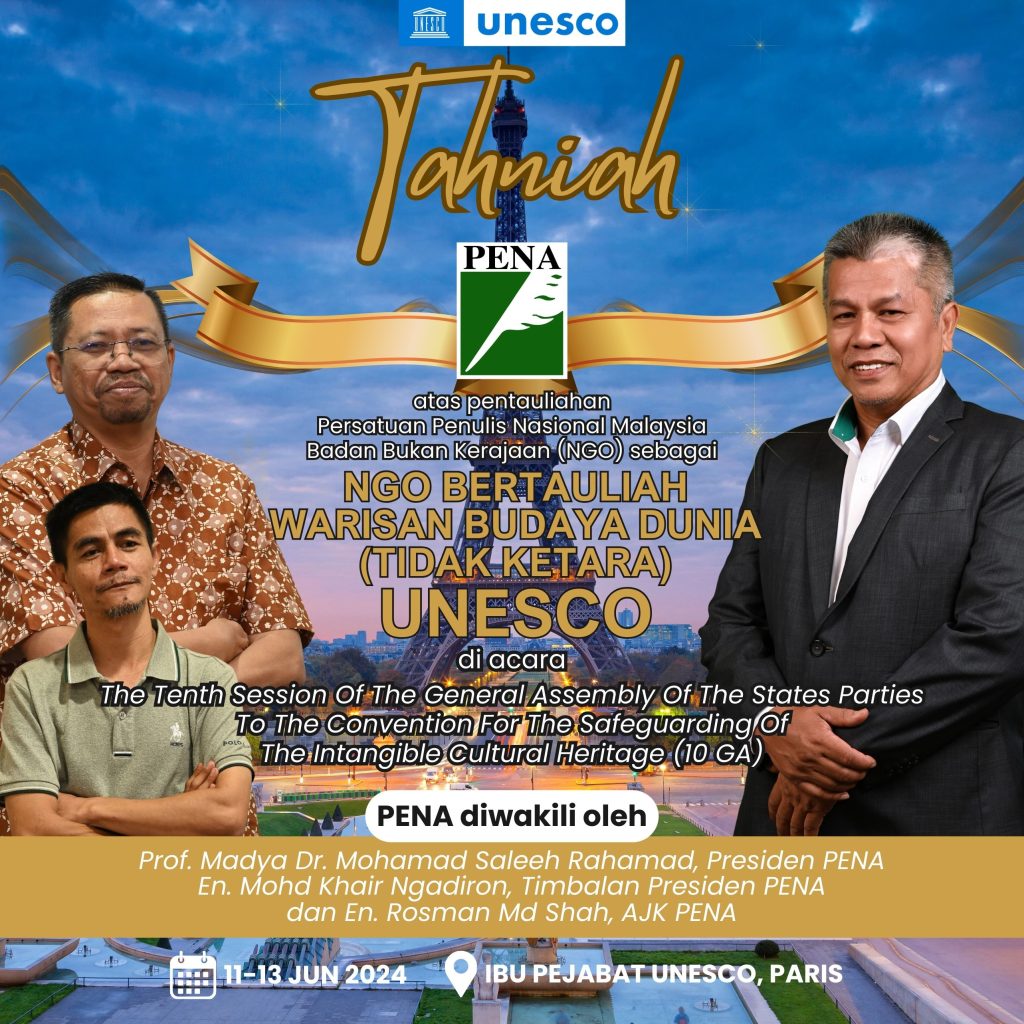 Tahniah diucapkan kepada Persatuan Penulis Nasional Malaysia (PENA) atas pentauliahan sebagai NGO Warisan Budaya Dunia (Tidak Ketara) di bawah UNESCO yang akan disampaikan ketika acara ‘The Tenth General Assembly Of The States Parties To The Convention For The Safeguarding Of The Intangible Cultural Heritage‘ yang akan berlangsung di Ibu Pejabat UNESCO di Paris pada 11 hingga 13 Jun 2024 ini.