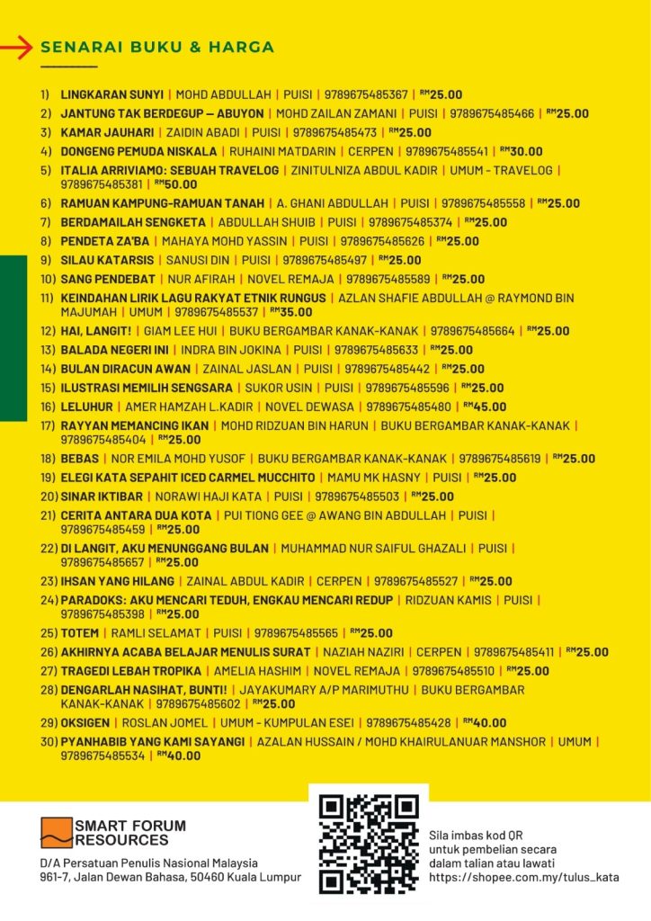 PENA mengalu-alukan orang ramai untuk mengunjungi reruai Tulus Kata @ PENA di P50 dan P60 Setia City Convention Centre sepanjang pameran. Buku-buku dalam koleksi ini juga boleh didapati dalam talian melalui Shopee untuk memudahkan akses kepada pembaca di seluruh Malaysia.