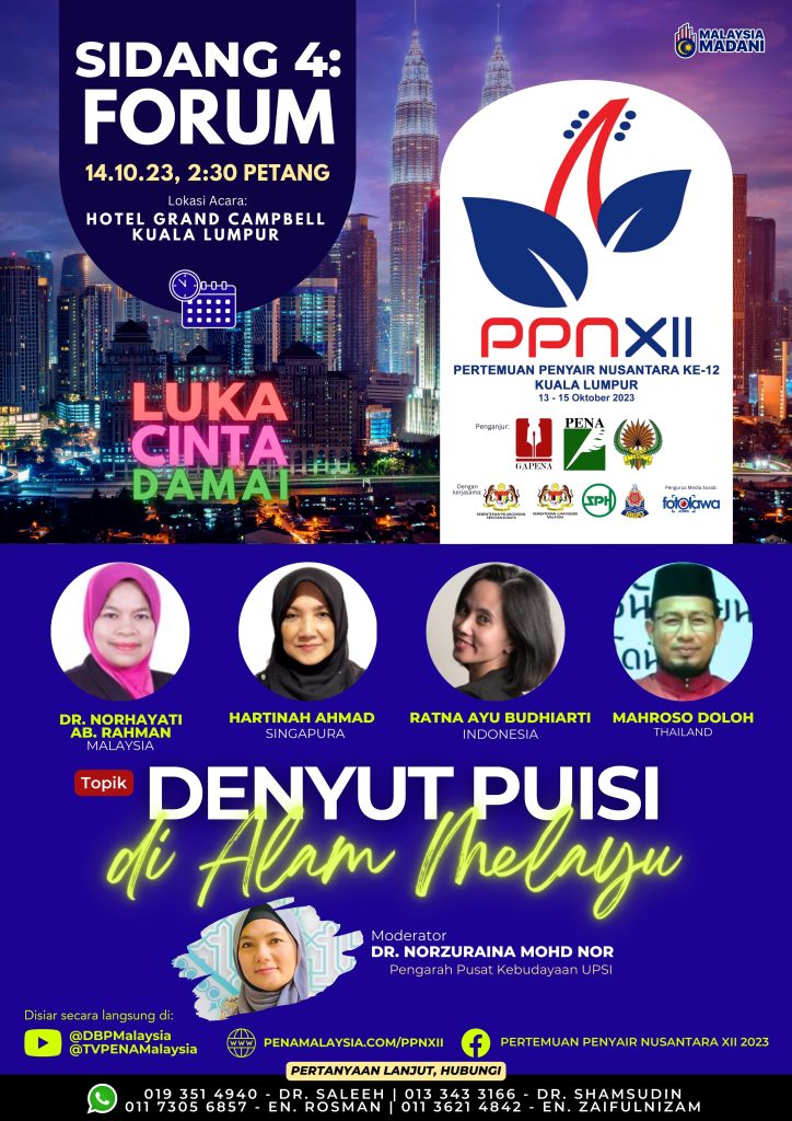MODERATORDR. NORZURAINA MOHD NOR atau lebih dikenali sebagai Ayudez Zuraina. Beliau merupakan Pengarah Pusat Kebudayaan dan Pensyarah kanan di Jabatan Seni, dan Reka bentuk Fakulti Seni Komputeran dan Industri Kreatif UPSI. Beliau juga banyak melibatkan diri dalam aktiviti seni, sastera dan budaya sebagai aktivis, penulis dan penyair dalam negara dan luar negara serta bergiat aktif dalam pembabitan dalam bidang penulisan kreatif pelbagai genre penulisan dan penerbit program sastera budaya.